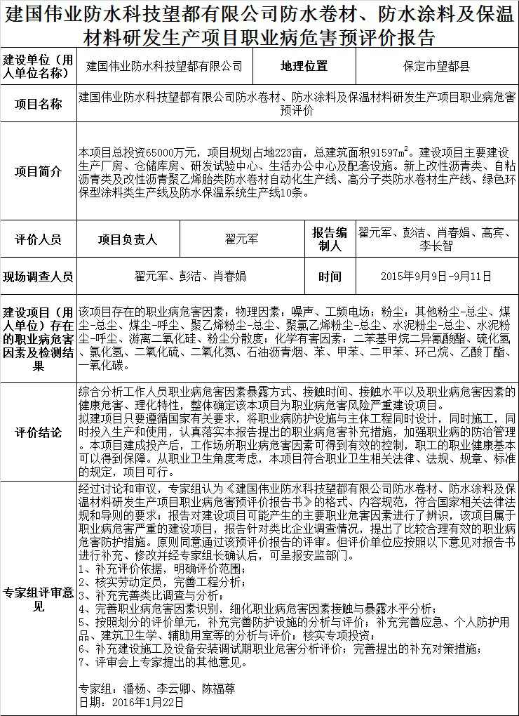 建国伟业防水科技望都有限公司防水卷材、防水涂料及保温材料研发生产项目职业病危害预评价